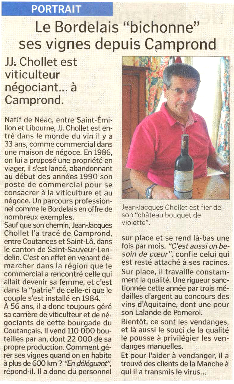 Le Bordelais « bichonne » ses vignes depuis CamprondBillet publié dans Presse (mis à jour le 27 juillet 2015) La Manche Libre – Edition Coutances JJ. Chollet est viticulteur négociant… à Camprond